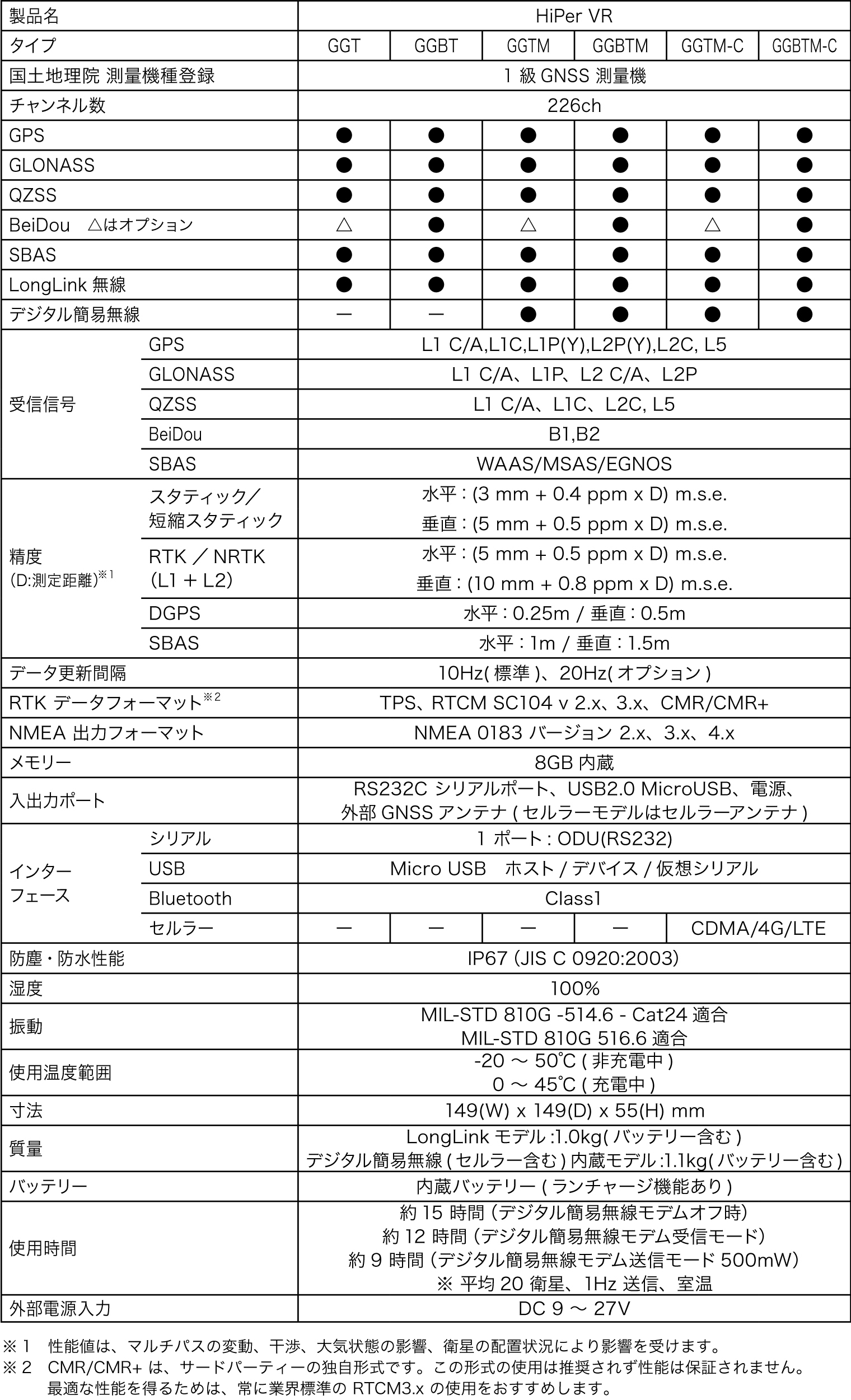 ・HiPer VR 本体 ・AC アダプター(12V5A) ・AC ケーブル ・電源3ピン-2ピン変換アダプター ・受信機用電源ケーブル ・MicroUSB ケーブル ・シリアルケーブル ・デジタル無線アンテナ EA0237 (デジタル簡易無線内蔵モデルのみ) ・4G LTEアンテナ (セルラー内蔵モデルのみ) ・100mm スペーサー (セルラー内蔵モデルのみ) ・アンテナ高計測プレート ・プラグM ユニット ・格納ケース ・背負いベルト・安全上のご注意/標準構成品一覧 ・HiPer VR クイックリファレンス ・保証書 ・輸出規制カード |