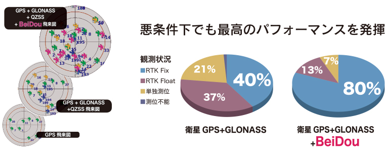 GNSS測量において受信衛星数が大きく増えると、初期化時間の短縮、環境変化における精度安定性の向上、長時間にわたる安定測位能力の向上等、全ての面で測位にプラス効果を発揮します。 従来諦めていた環境での測位が可能となるとともに、悪条件下で初期化待ちなどのストレスからも解放され作業の生産性が向上します。 |