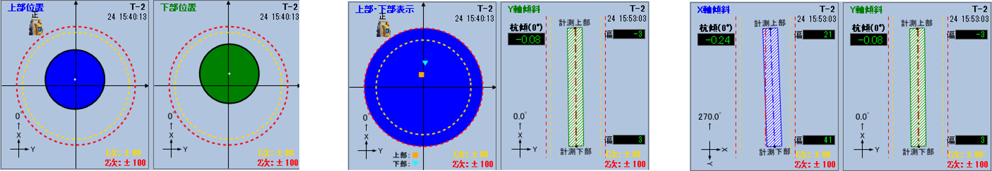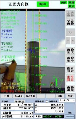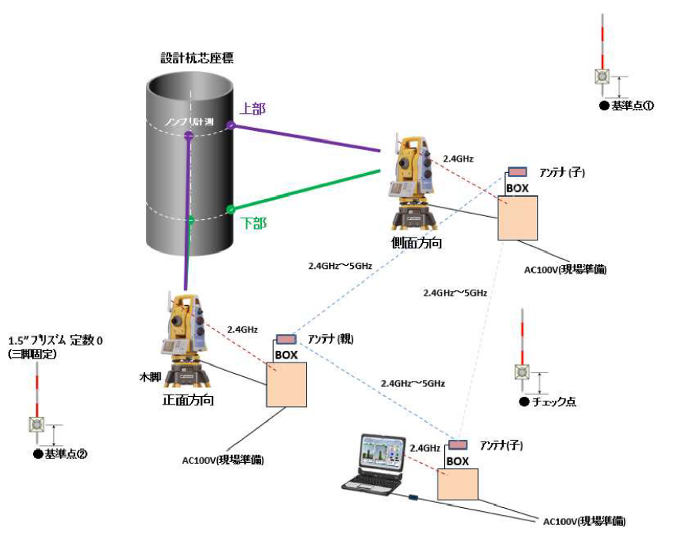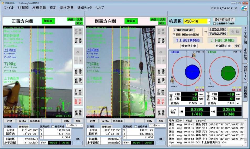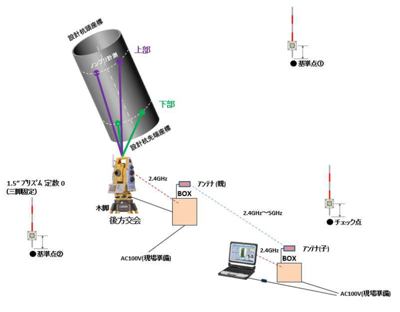 | 三点式杭打ち機・オールケーシングなどの鉛直杭が対象。 上部2点・下部2点をノンプリズム計測し、上部・下部の杭の中心から傾斜を計算する。 ※鉛直方向に対する傾斜値 |