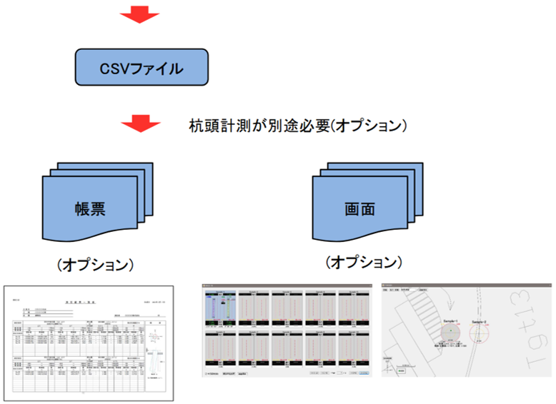 ● 計測結果をCSV・画像データとして出力。 ![]() ● 帳票出力(オプション) 計測を行い、出来形データを作成し、更にその出来形データから帳票を作成する。 この流れの中で、中心的役割を果たす出来形データの関連図を下記に示します。 |